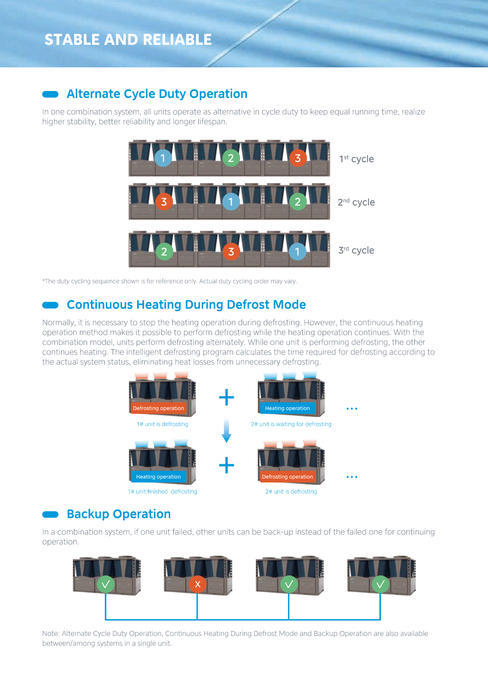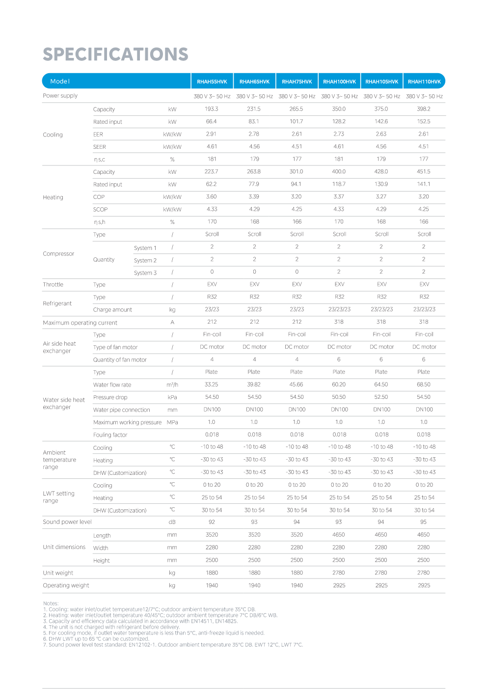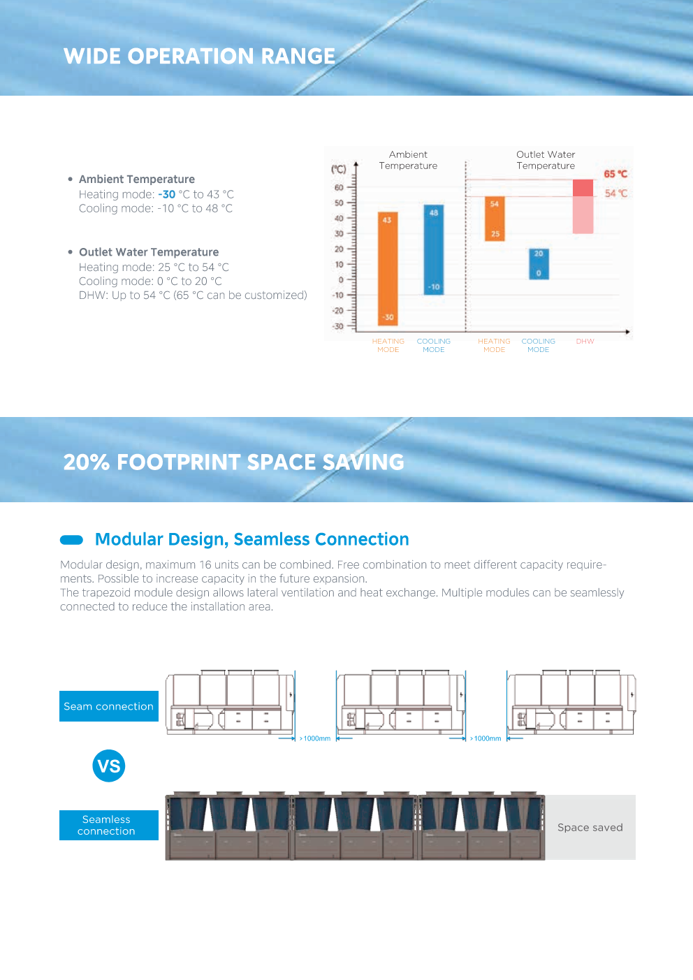 R32 Inverter Air Cooled Scroll Heat Pump with output up to 65°. Minimum ambient -25°. Inverter technology allows precise consumption on real load. Integrated pump module available. Up to 16 units can be connected to operate as a single unit.
