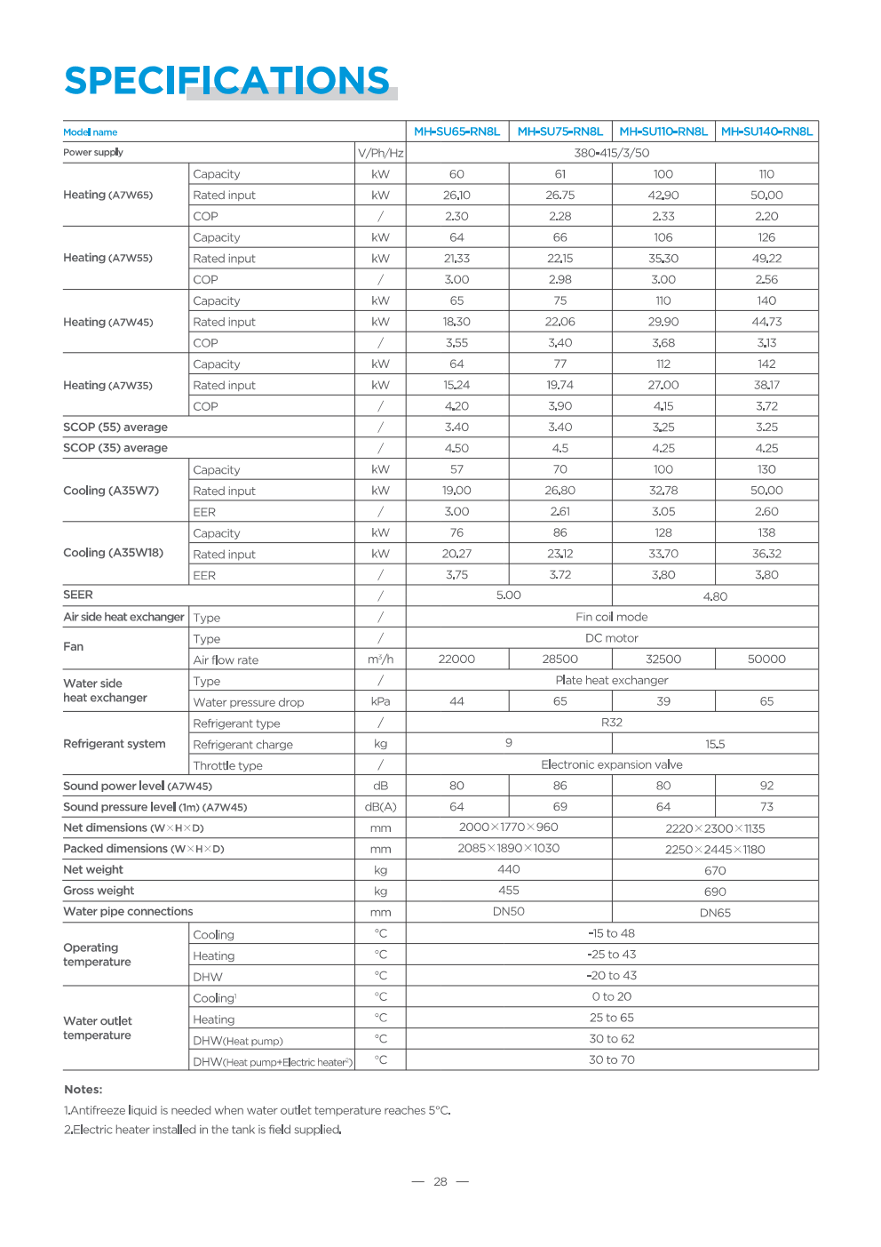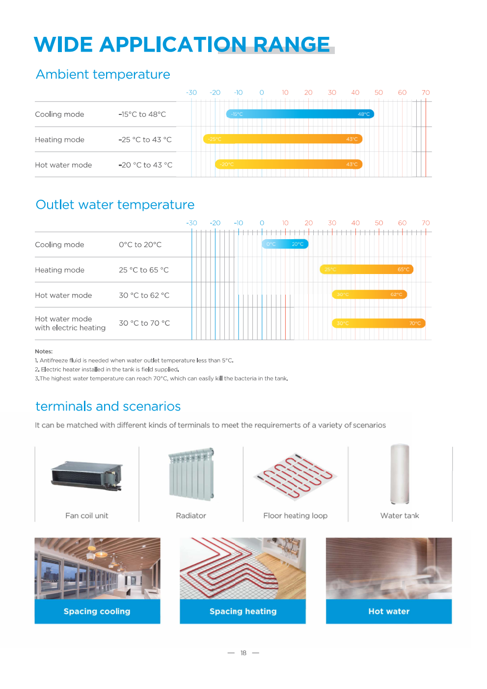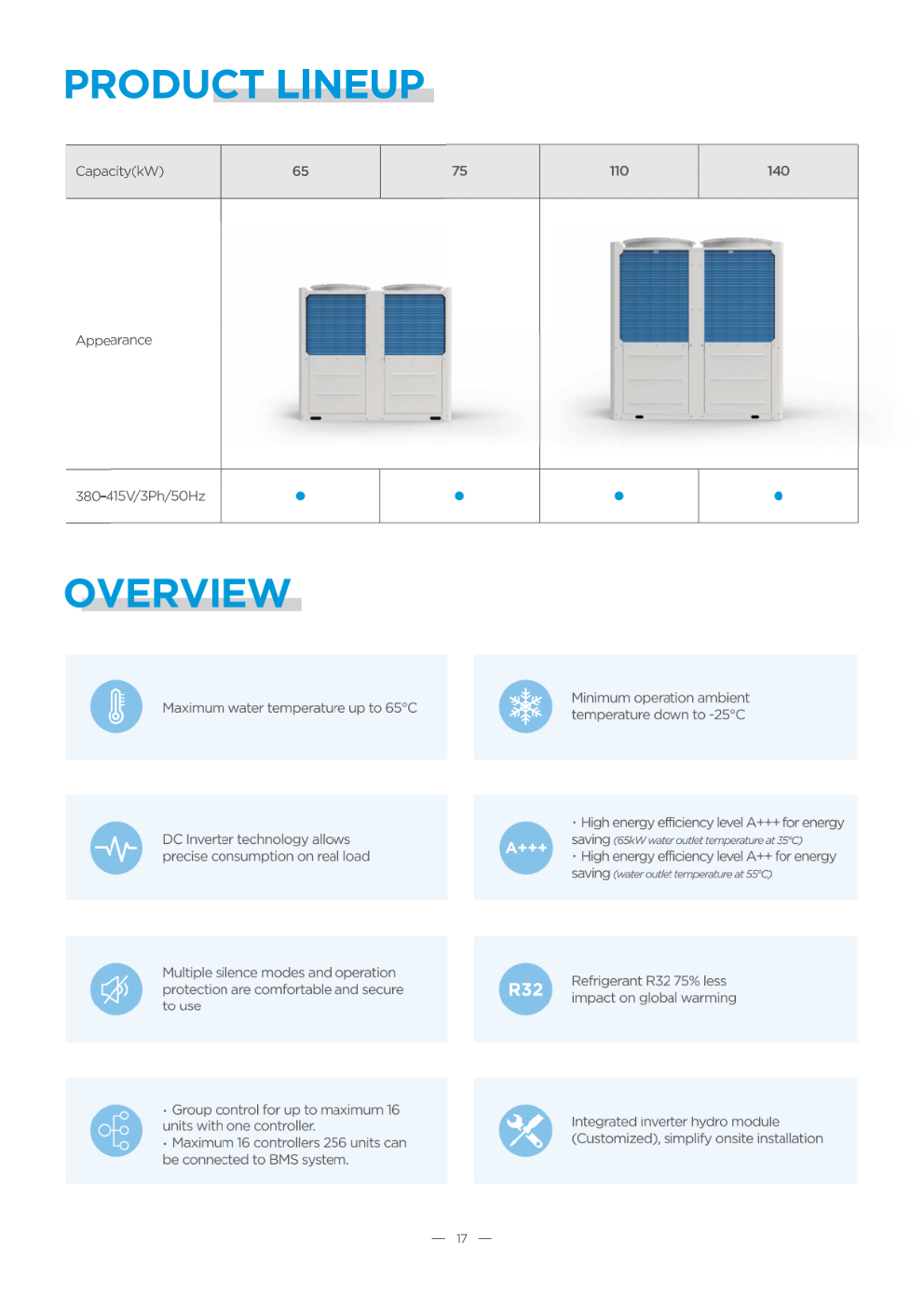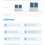 Modular Heat Pump with output up to 65°. Minimum ambient -25°. Inverter technology allows precise consumption on real load. Integrated pump module available. Up to 16 units can be connected to operate as a single unit.