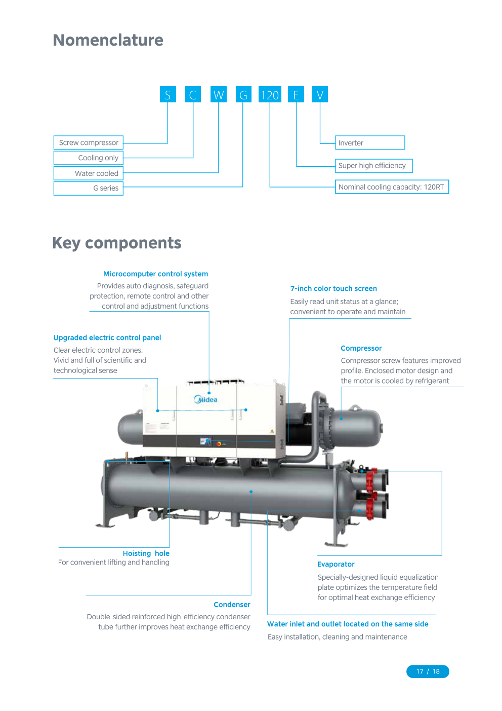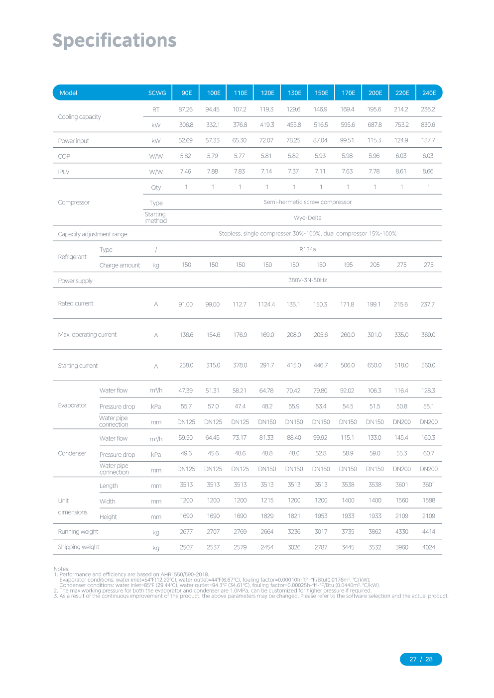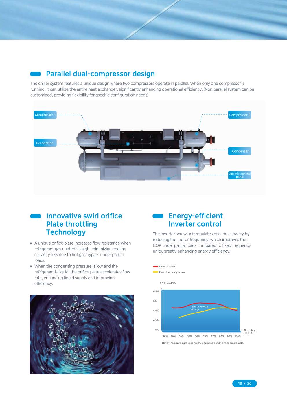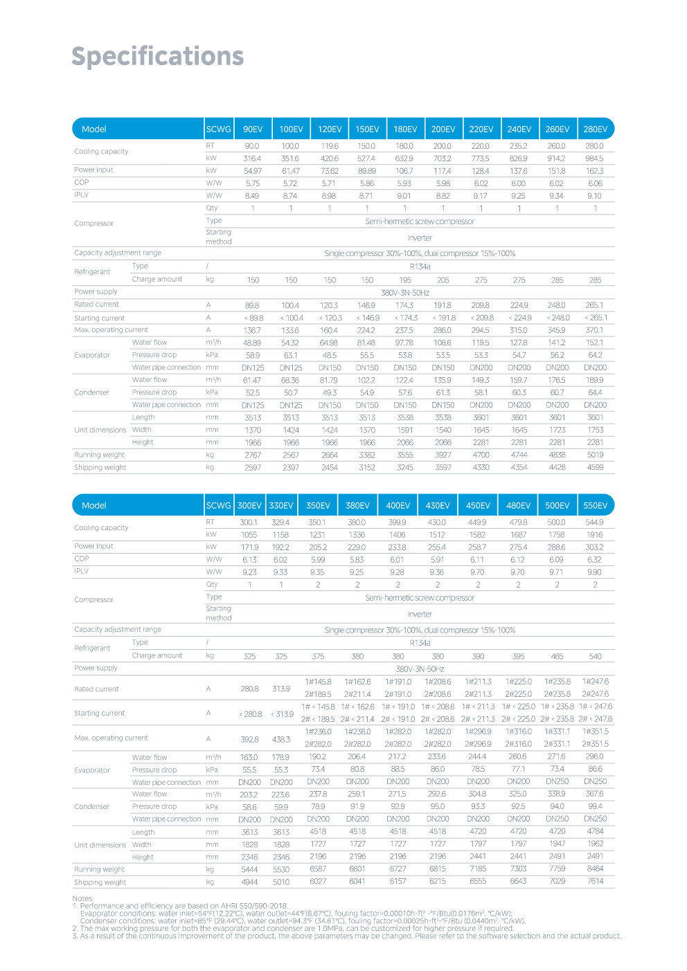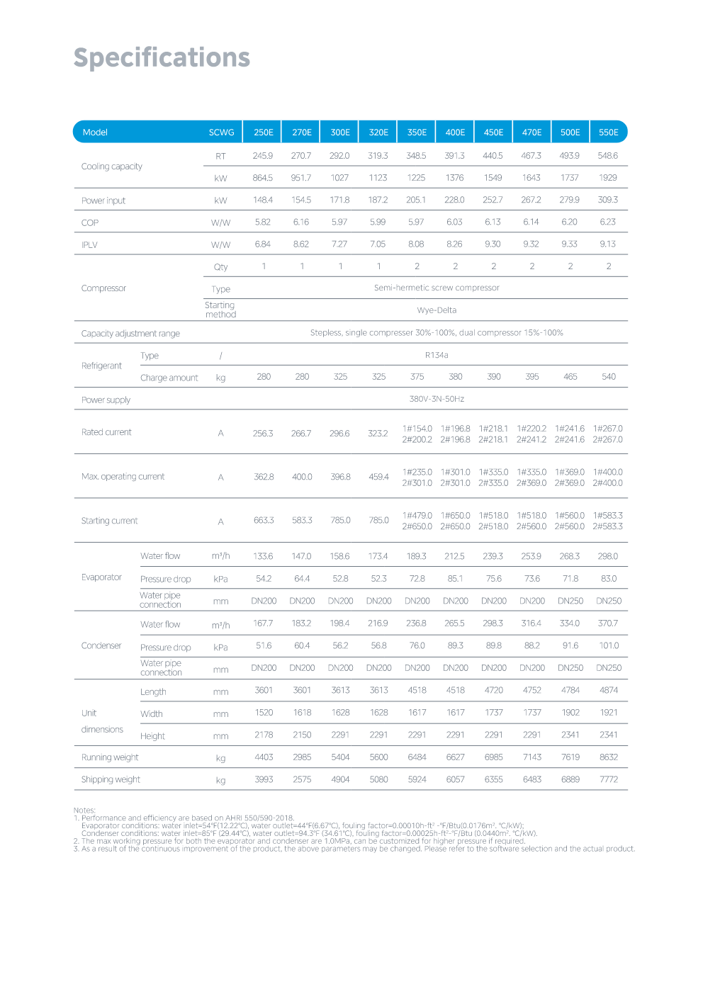 The high efficiency full falling film water cooled screw chiller adopts the industry leading twin-rotor screw compressor, environmentally-friendly R134a refrigerant and full falling film evaporation technology to achieve efficiency for high full loads and partial loads.